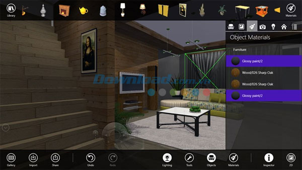 Người dùng có thể xem nội thất trong một môi trường 3D với hiệu ứng ánh sáng và đổ bỏng theo thời gian thực.